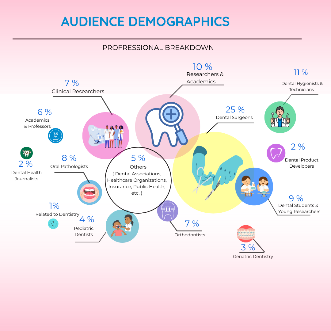 Our congress brings together a diverse and multidisciplinary audience of professionals from across the dental and healthcare community. The breakdown reflects a balanced mix of experts, practitioners, academics, and young professionals committed to advancing the field of dentistry and oral health.