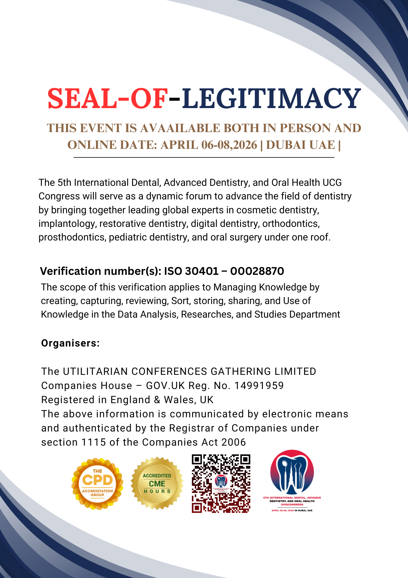 The Seal of Legitimacy for the 5th International Dental, Advanced Dentistry, and Oral Health UCG Congress affirms that the event is a recognized, credible, and trusted platform for dental experts, researchers, academicians, and practitioners worldwide.